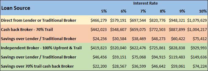 The following table shows the cost of interest you would pay if you took the loan direct from the Lender or via a traditional mortgage broker, the cost of interest assuming you get 70% of the trailing commissions, and the cost of interest if you receive 100% of both upfront and trailing commission. It also shows the relative savings of one option over another.